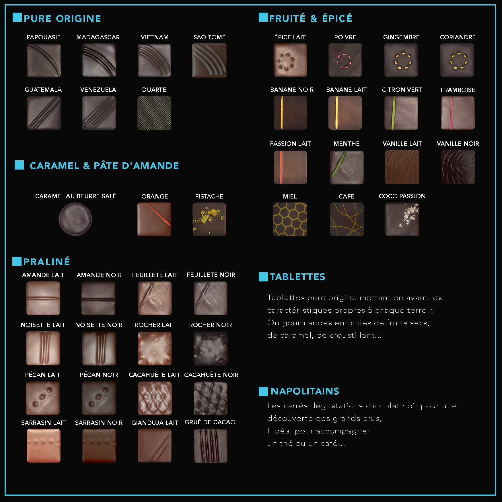 Pâte de cacao, sucre, beurre de cacao, crêpe fraîche, beurre AOP, lait en poudre, sirop de glucose, sorbitol, sucre inverti, amande, noisette, pistache, sésames, cacahuètes, pulpe de fruits (framboise, passion, citron vert, banane, coco, marron), menthe, poivres, coriandre, cannelle, gingembre, vanille, angélique, zestes de citron, orange confite, miel, thés, cafés, crêpe dentelle (farine de blé, sucre, matière grasse laitière anhydre, sucre et protéines du lait, sel, farine de malt d’orge, poudre à lever E500ii-bicarbonate de sodium), éclats de fève de cacao, sel, fleur de sel, pectine, acide citrique, lécithine de soja sans OGM.