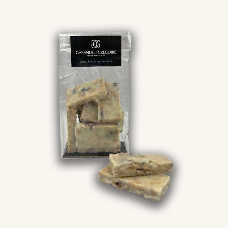 Chocolat blanc minimum 32% de cacao (sucre, poudre de lait, beurre de cacao, émulsifiant : lécithine de soja sans OGM), noix de pécan, cranberry, crêpe dentelle (farine de blé, sucre, beurre concentré 8%, sucre et protéines de lait, extrait de malt (orge), poudre à lever (E500ii)