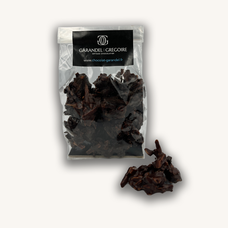 Chocolat noir minimum 70% de cacao (pâte et beurre de cacao, sucre, émulsifiant : lécithine de soja sans OGM), fruits à coques : amandes, raisins bio, crêpe dentelle (farine de blé, sucre, beurre concentré 8%, sucre et protéines du lait, extrait de malt (orge), poudre à lever (E500ii)