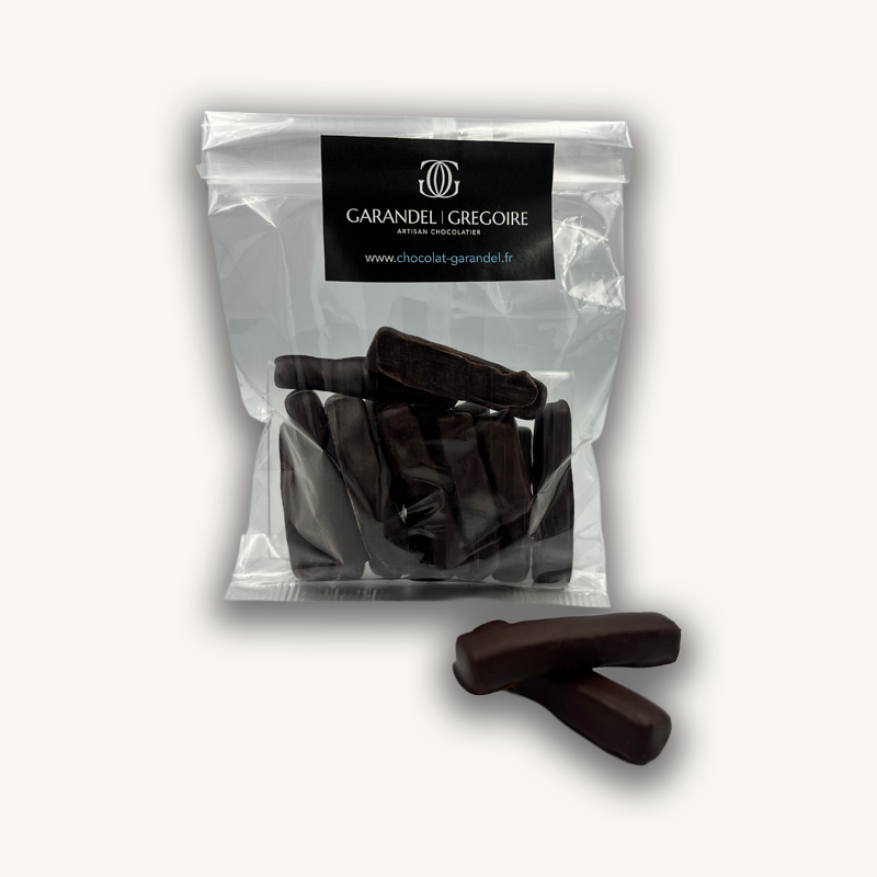 Gingembre confit 70% (gingembre, sucre, glucose), chocolat noir minimum 70% de cacao (pâte de cacao, sucre, beurre de cacao, lécithine de soja sans OGM)