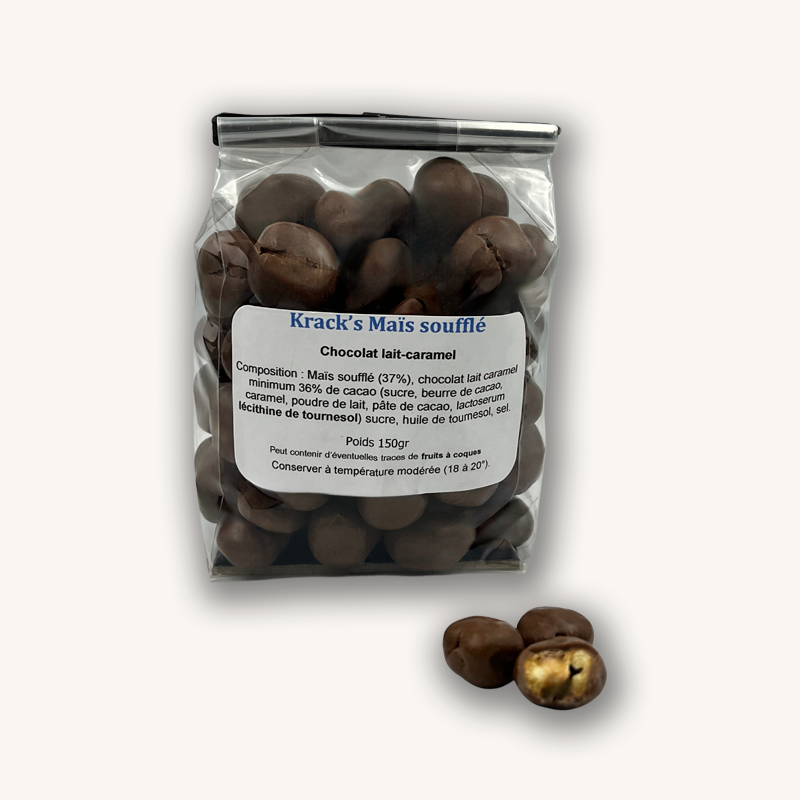 Maïs soufflé (37%), chocolat lait caramel minimum 36% de cacao (sucre, beurre de cacao, caramel, poudre de lait, pâte de cacao, lactosérum lécithine de tournesol), sucre, huile de tournesol, sel