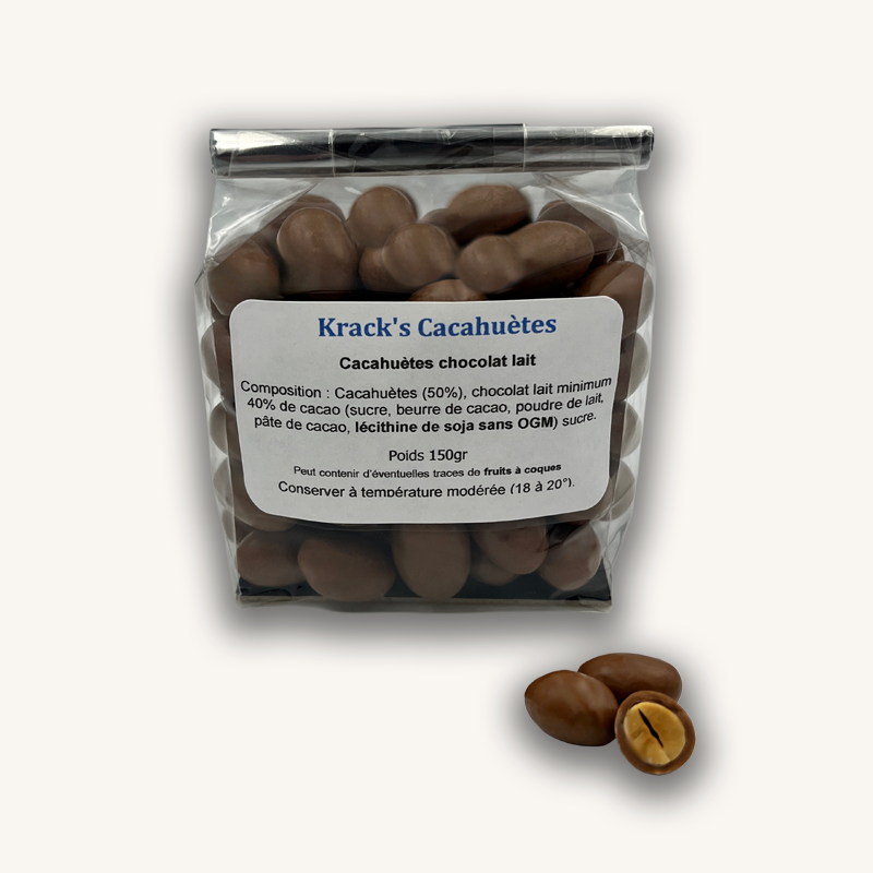 Cacahuètes (50%), chocolat lait minimum 40% de cacao (sucre, beurre de cacao, poudre de lait, pâte de cacao, lécithine de soja sans OGM), sucre