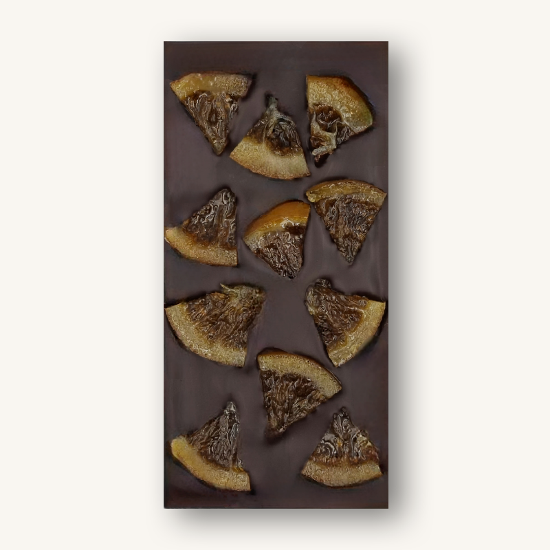 Chocolat noir minimum 70% de cacao (pâte de cacao, sucre, beurre de cacao, lécithine de soja sans OGM), orange confite 30% (orange, sucre, glucose).