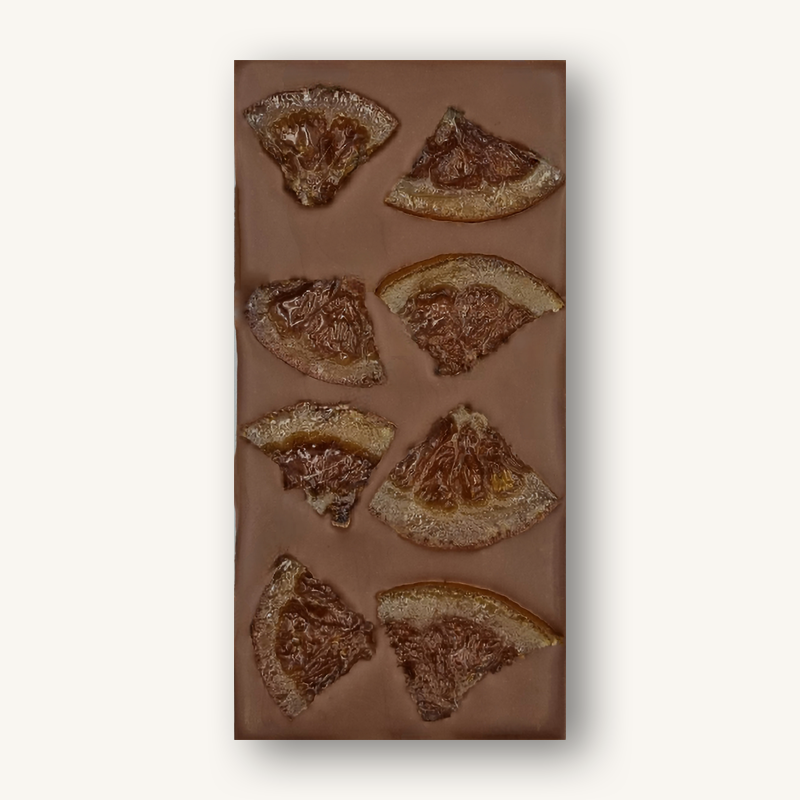Chocolat lait minimum 40% de cacao (sucre, beurre de cacao, poudre de lait, pâte de cacao, lécithine de soja sans OGM), orange confute 30% (orange, sucre, glucose).