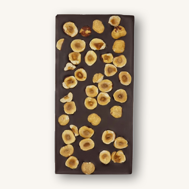 Chocolat noir minimum 70% de cacao (pâte de cacao, sucre, beurre de cacao, lécithine de soja sans OGM), noisettes 20%.