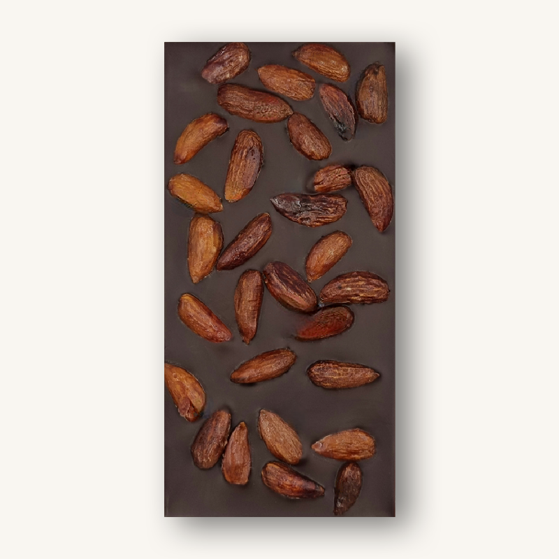 Chocolat noir minimum 70% de cacao (pâte de cacao, sucre, beurre de cacao, lécithine de soja sans OGM), amandes caramélisées 20%.